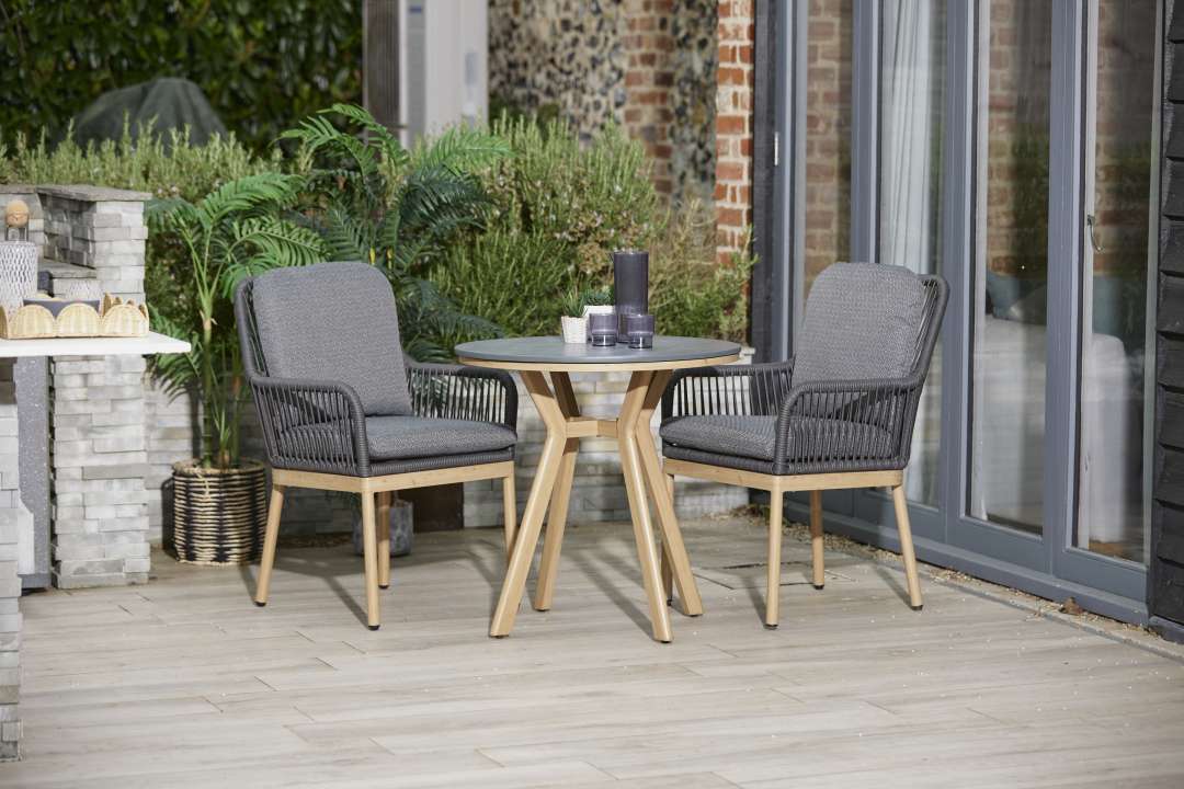 The Peru Charcoal Everope Collection combines clean, contemporary lines with classic outdoor durability. Its tightly woven PE rope forms a striking, modern pattern, while the stone-effect Stone-Tek tabletops contrast beautifully with wood-effect frames for a sophisticated look.
