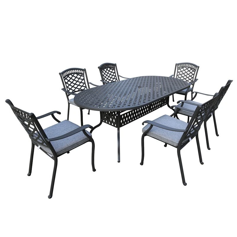Made from aluminium frames, the Pescara 6 Seat Dining Set is well suited to the outdoor climate. Made from cast aluminium, the Pescara range is lightweight, low maintenance, rust free and can be left outside all year round. All frames are powder coated and hand finished for a traditional look. The charcoal frame is complimented by Caramel cream base cushions, which are zipped for removal to facilitate easier cleaning.